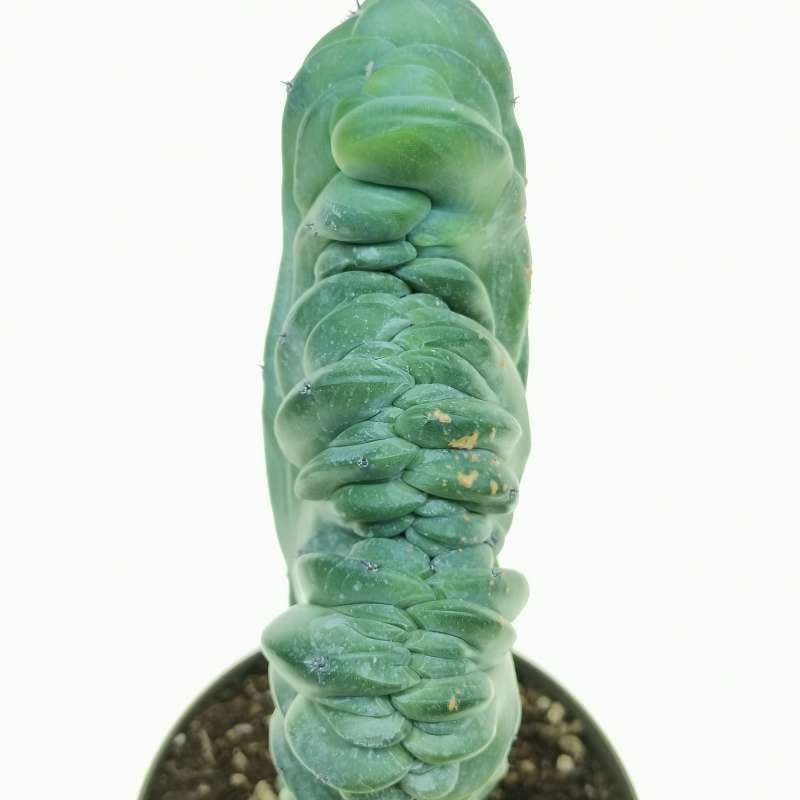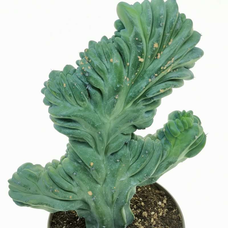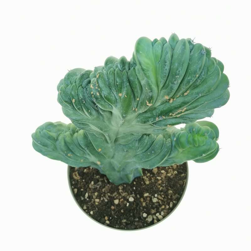 Myrtillocactus geometrizans crested form is a beautiful succulent plant that sports a bluish green stem (also commonly called 'blue candle' or 'blue candelabra') and has numerous well-marked ribs, which give the plant a unique appearance of its kind . In fact its 'fan' due to its crested shape is among the most sought after by succulent plant lovers, it is highly appreciated for its unique and unusual shape. Its elegant and uniform crest makes it perfect for decorating modern interior spaces as it goes perfectly with designer vases. The beautiful flowers of this succulent plant bloom along the entire stem, especially at the apex; They have delicate creamy white petals with light greenish tones in the central line of the petals, creating an eye-catching contrast with the bluish green color in the epidermis and giving a touch of delicacy to this living sculpture! Crested M. geometrizans makes a fantastic gift that will delight the recipient for years.